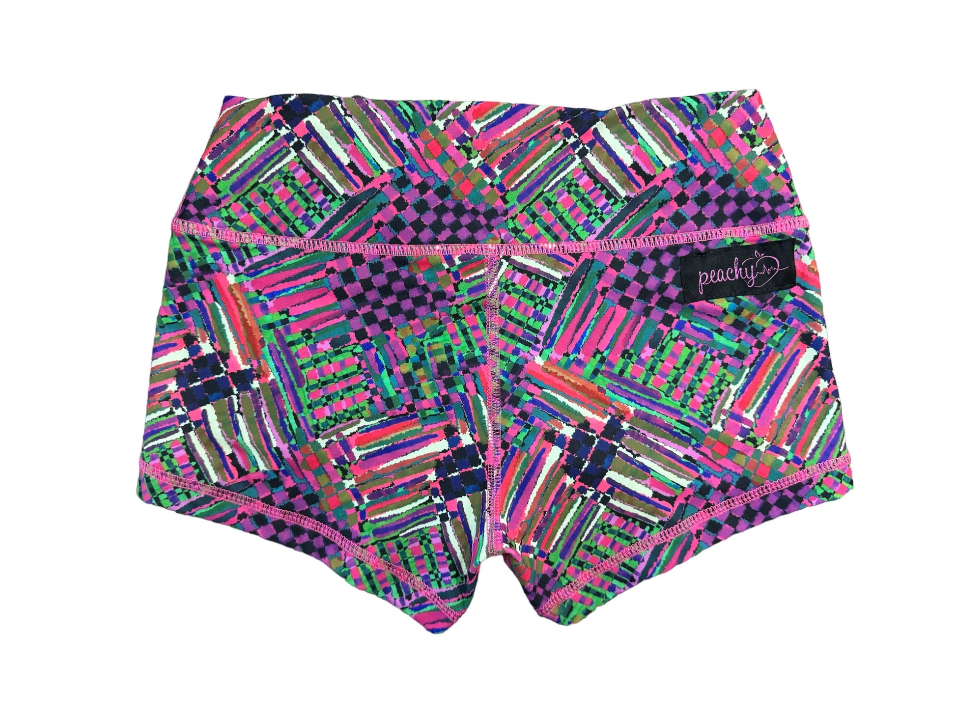 Alli I am in LOVE with these shorts. Super fun pattern. So colorful. Fit is perfect as always. Peachy never lets me down. These shorts are short enough not to get in the way. Keeping me cool and ready for all of my workouts. I love wearing such bright fun patterns.